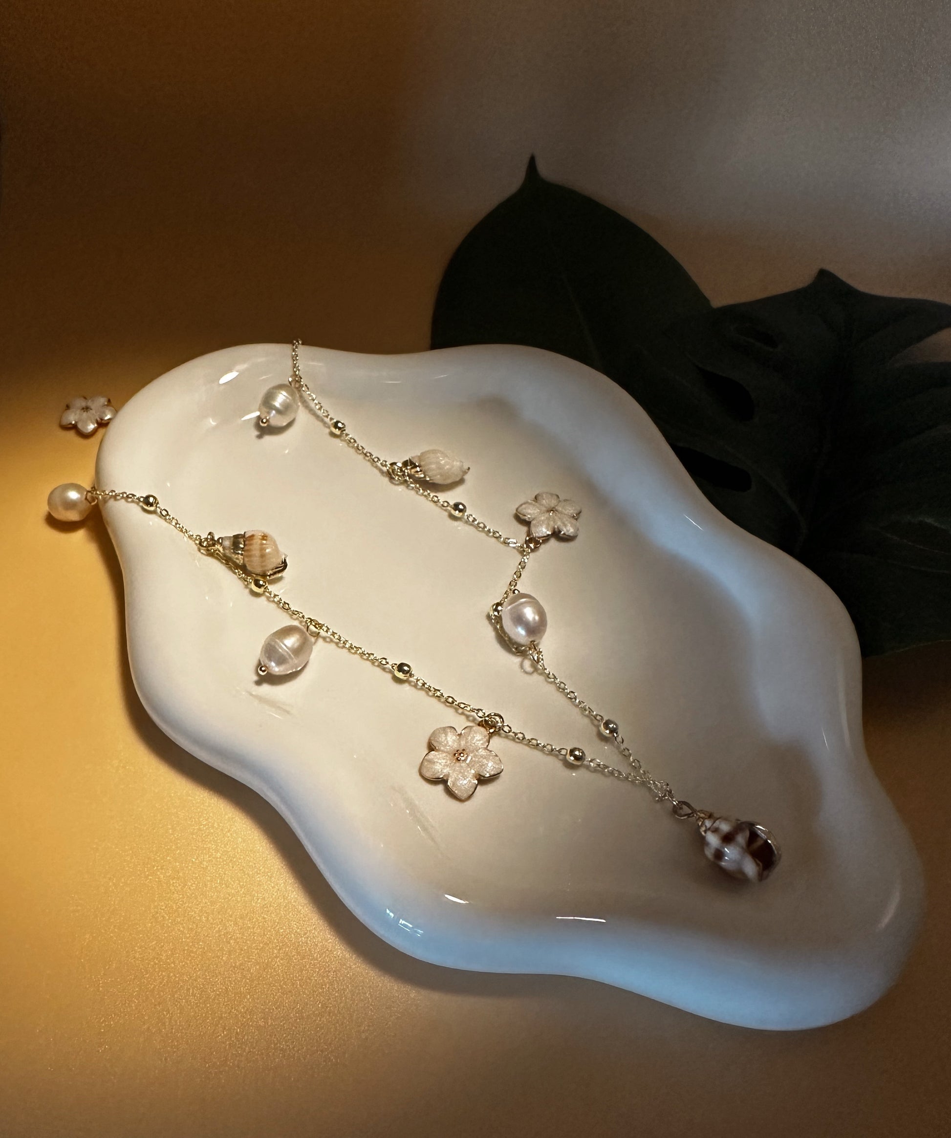 Brighten your look with the Charmed By The Sea necklace, a playful golden chain adorned with glossy gold marble flower charms and delicate gold-accented conch charms. This whimsical blend of ocean and garden elements adds a fun, sunny vibe to any outfit.