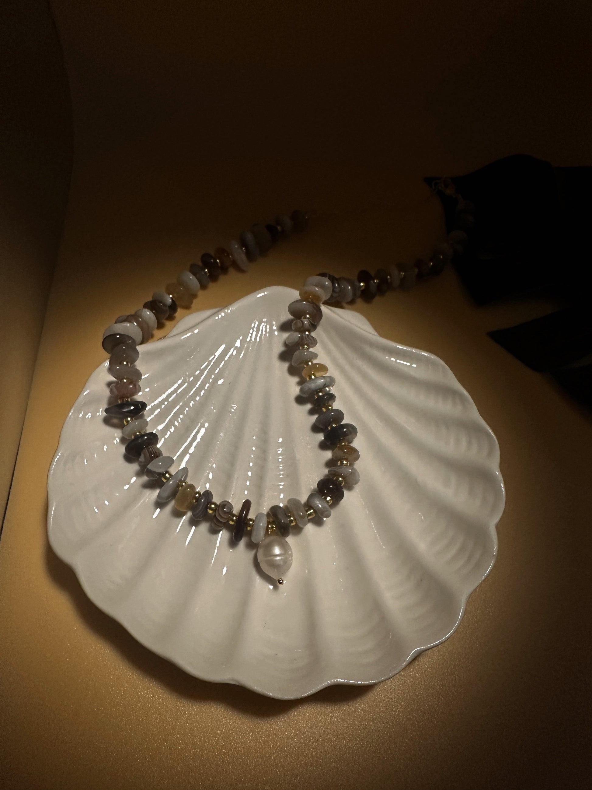 Inspired by nature’s raw beauty, the Desert Drift Necklace brings the calm of earthy landscapes to your style. Featuring polished agate and jasper-like stone beads in warm neutral tones, accented with golden spacers and anchored by a luminous freshwater-style pearl, this piece blends bohemian spirit with effortless elegance.