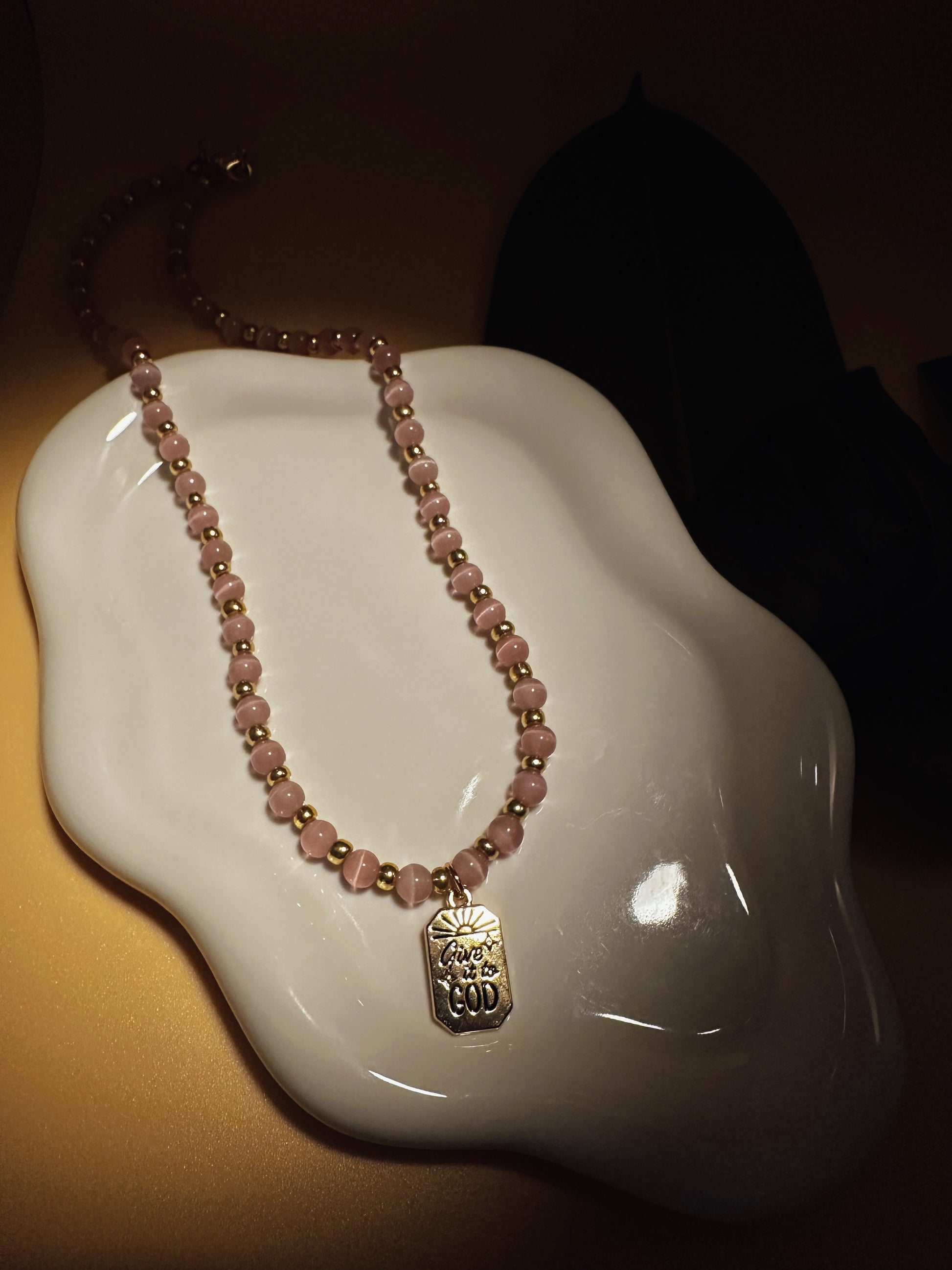 The Give It To God Necklace brings a playful pop of color with its gold and pink beads framing a shiny gold charm engraved with “Give It To God.” It’s a cheerful reminder to let go and embrace faith with style and fun.