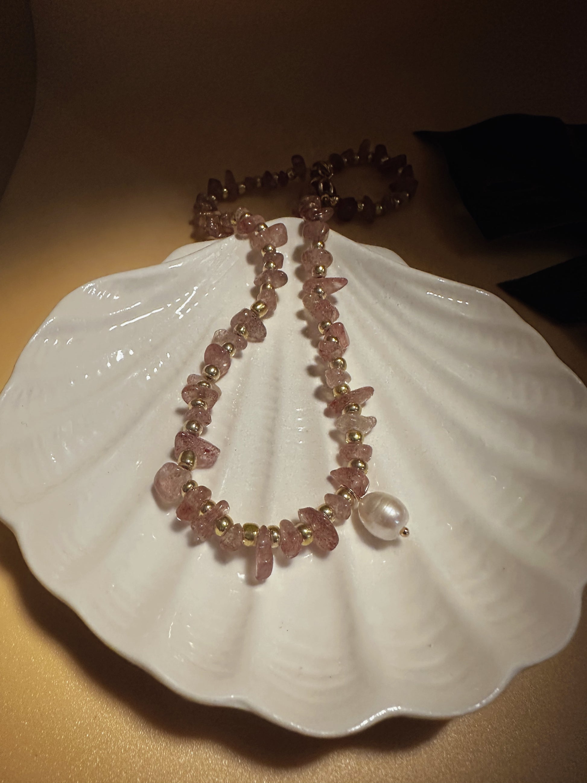 Add a splash of charm with this Gold And Rose' Necklace, featuring shimmering gold and rose-colored beads that playfully dance around a lustrous pearl centerpiece. Perfect for adding a touch of whimsy and elegance to any outfit!