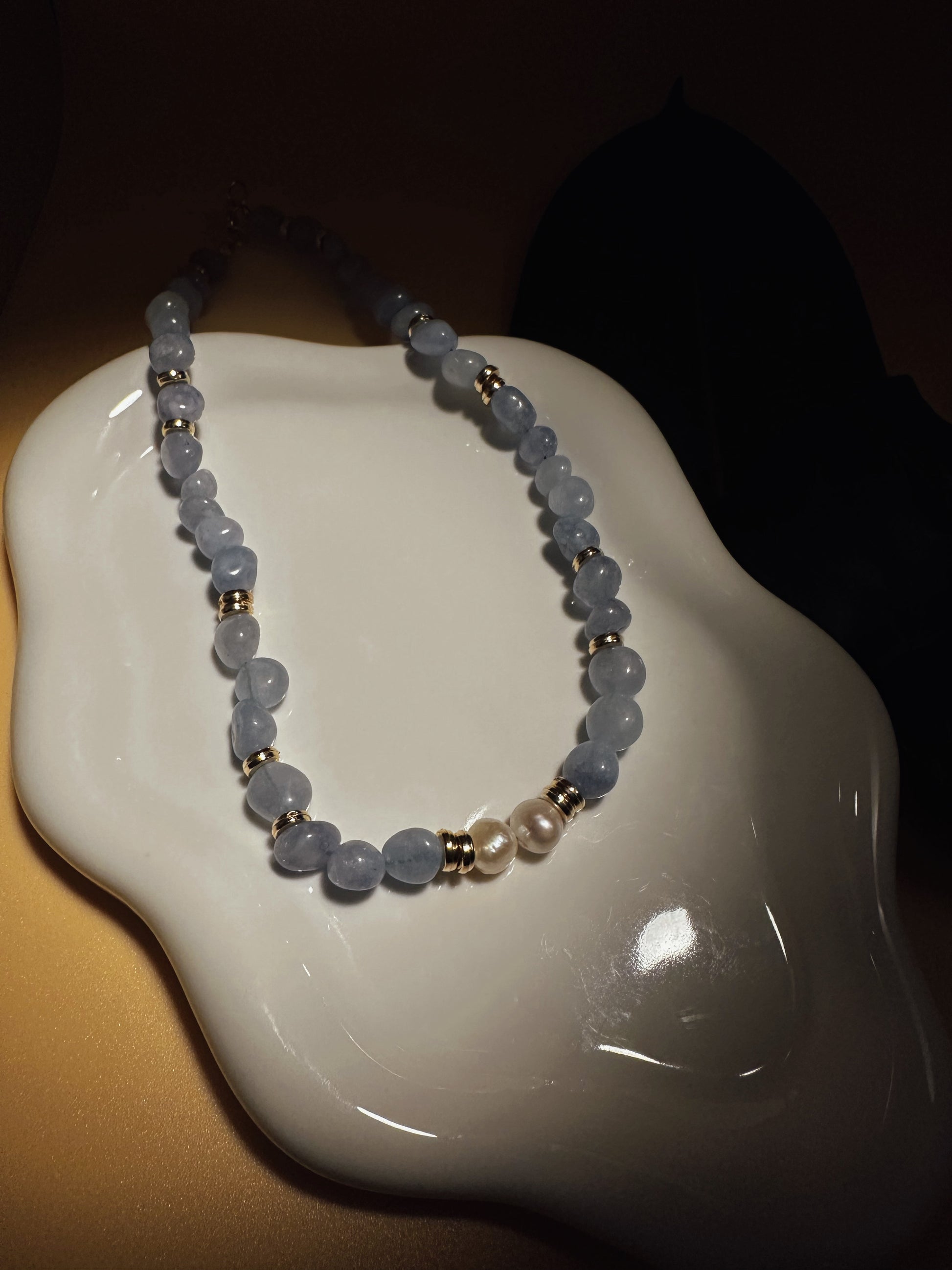 Dive into a splash of style with the Golden Tides Necklace! Bright blue beads meet shimmering gold spacer accents, framing two lustrous freshwater pearls at the center. This playful combination brings a touch of ocean charm to any outfit, making waves wherever you go. Perfect for those who love a pop of color with a hint of elegance.
