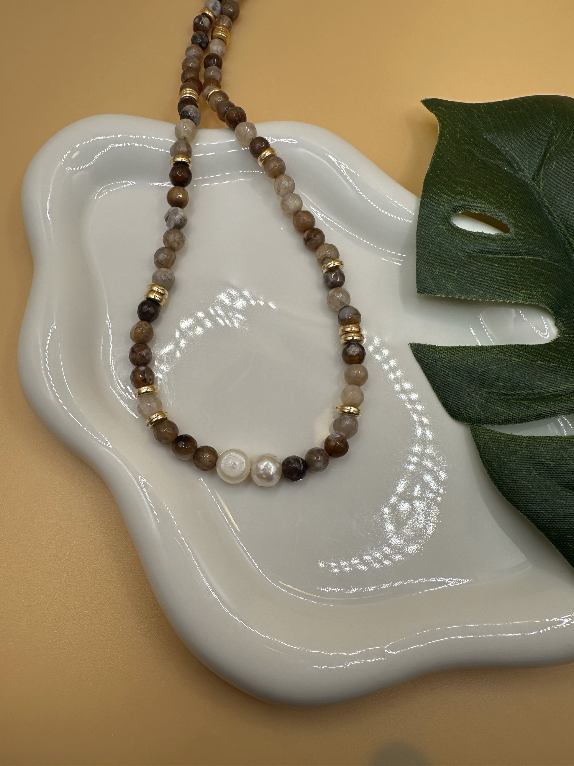 A warm and earthy beaded necklace featuring a mix of brown beads with subtle gold accents, beautifully centered with two lustrous freshwater pearls. Perfect for adding a touch of natural elegance to any outfit.