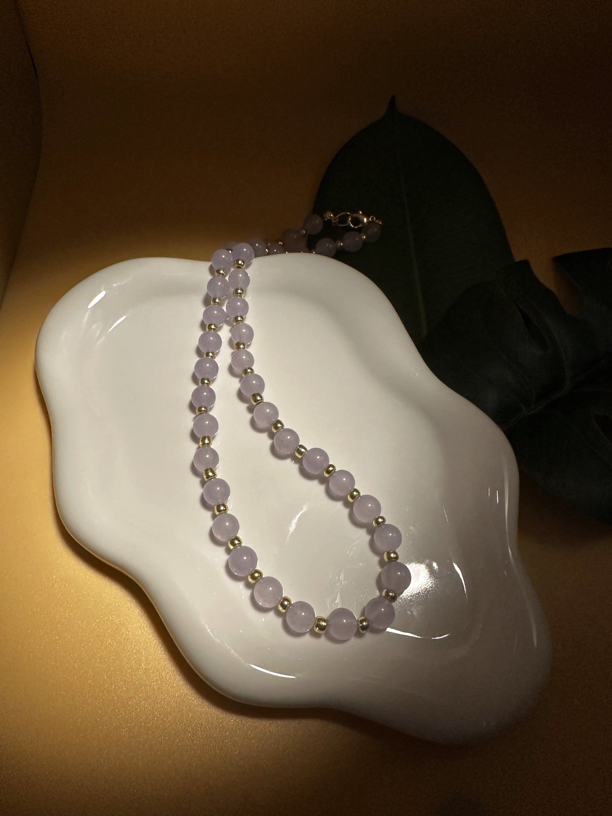 Add a touch of whimsy to your look with the Lavender Haze Necklace. Featuring soft lavender beads paired with shiny gold accents, this playful necklace brightens any outfit with a pop of color and charm. Perfect for layering or wearing solo, it’s a fun way to sparkle with subtle elegance every day.