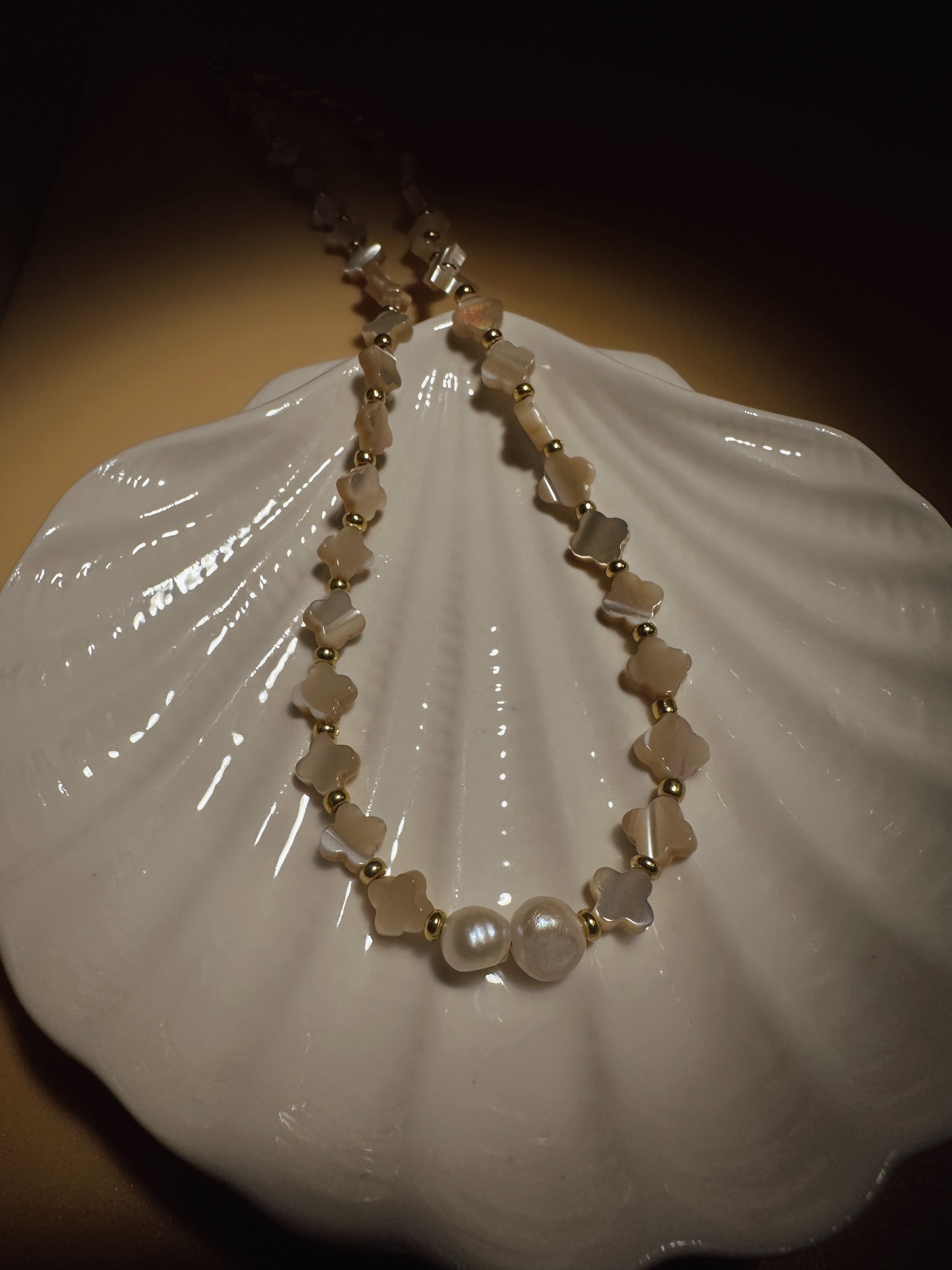 Brighten your style with the Moonlit Sands Necklace, featuring fun clover-shaped mother of pearl beads accented by shiny gold beads and two fresh water pearls. This playful mix brings a sparkling, joyful touch to any look.