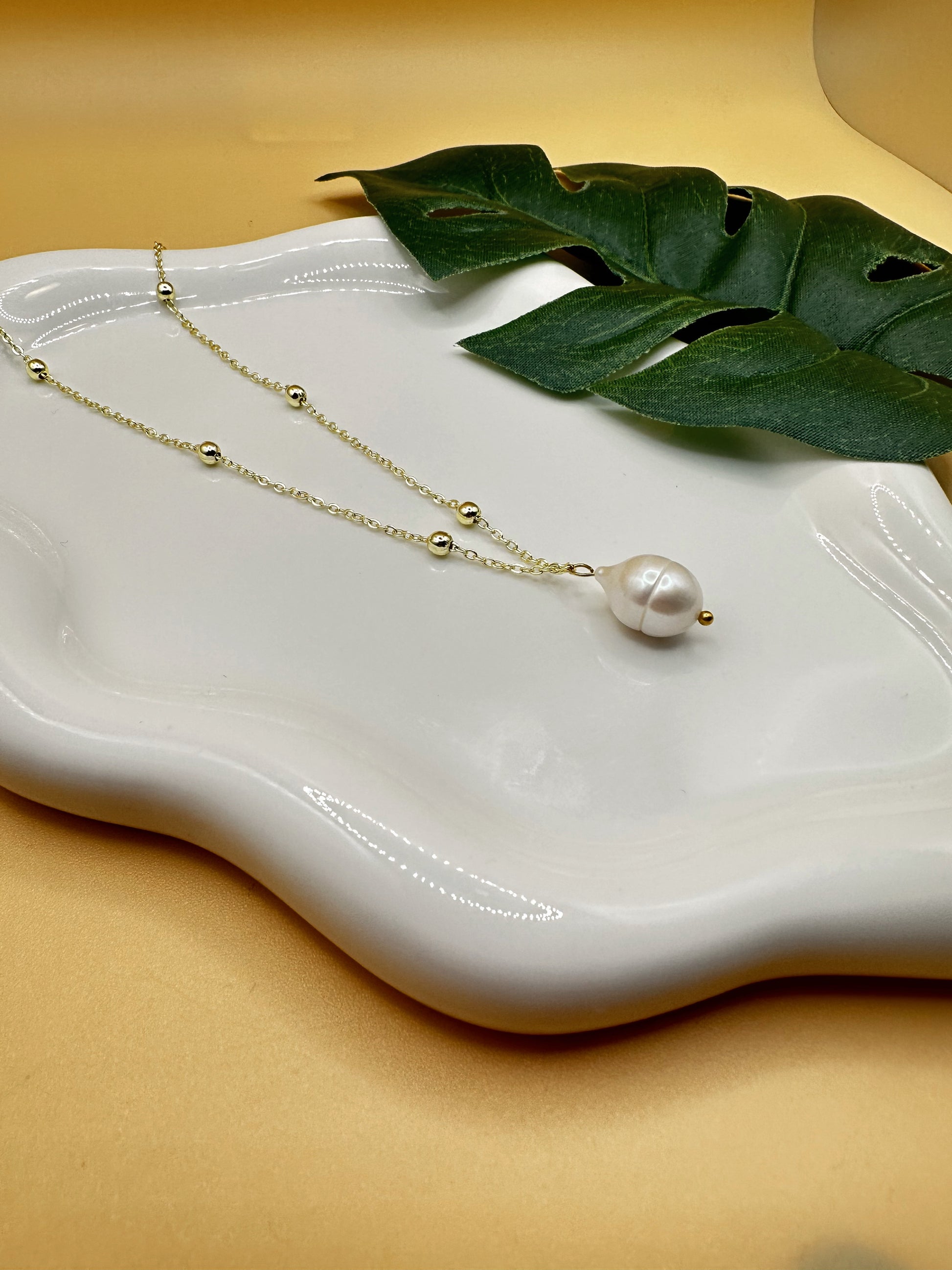 Add a playful sparkle to your look with the Pearl Drop Necklace! This delicate gold chain is dotted with shiny gold accent balls and features a simple, fresh water pearl that brightens up any outfit with effortless charm and fun vibes.