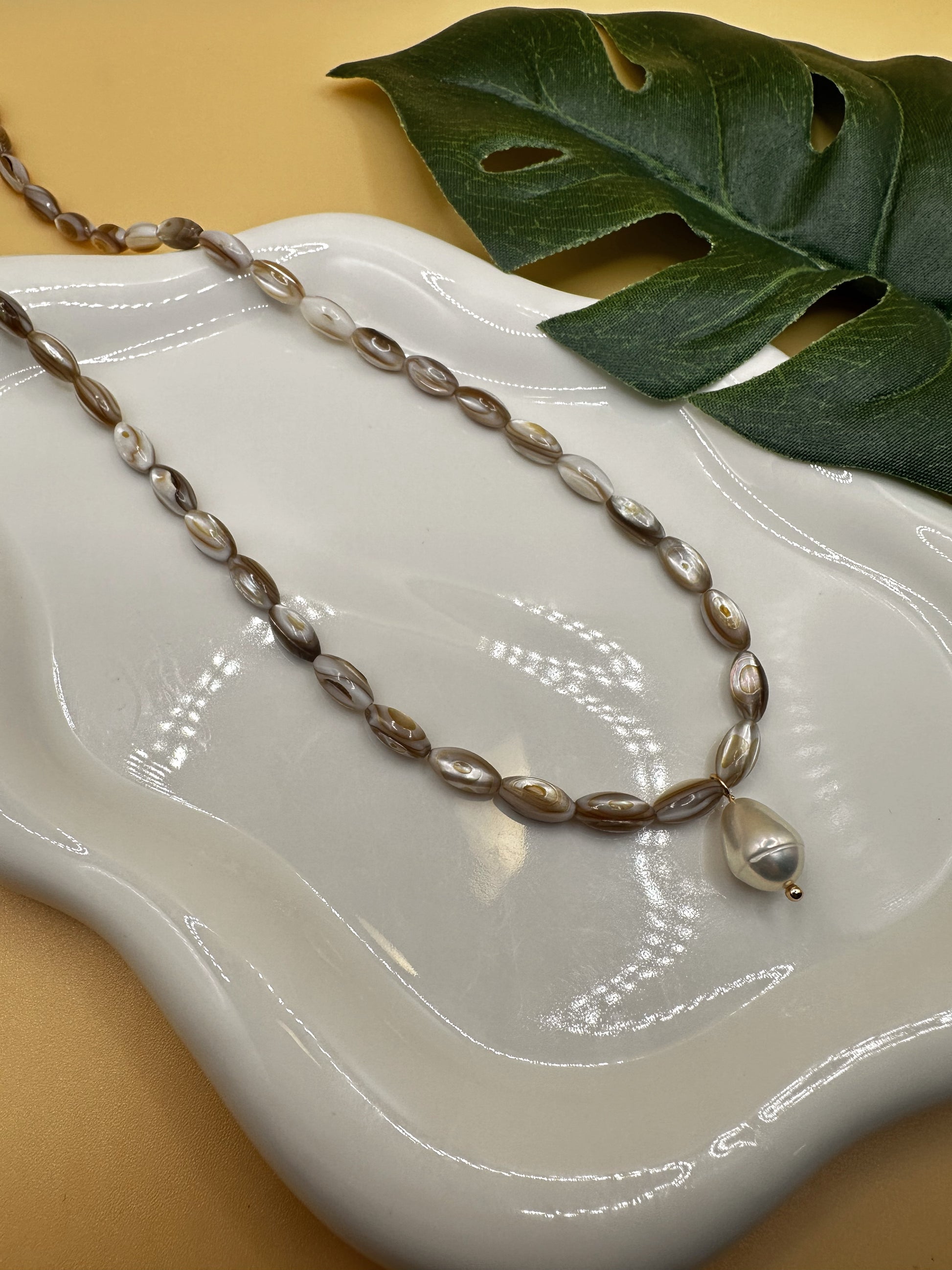 This necklace features warm-toned beads that flow into a luminous teardrop freshwater pearl pendant. Inspired by the beauty of the sea, it’s a timeless piece that adds a touch of natural elegance to any look.