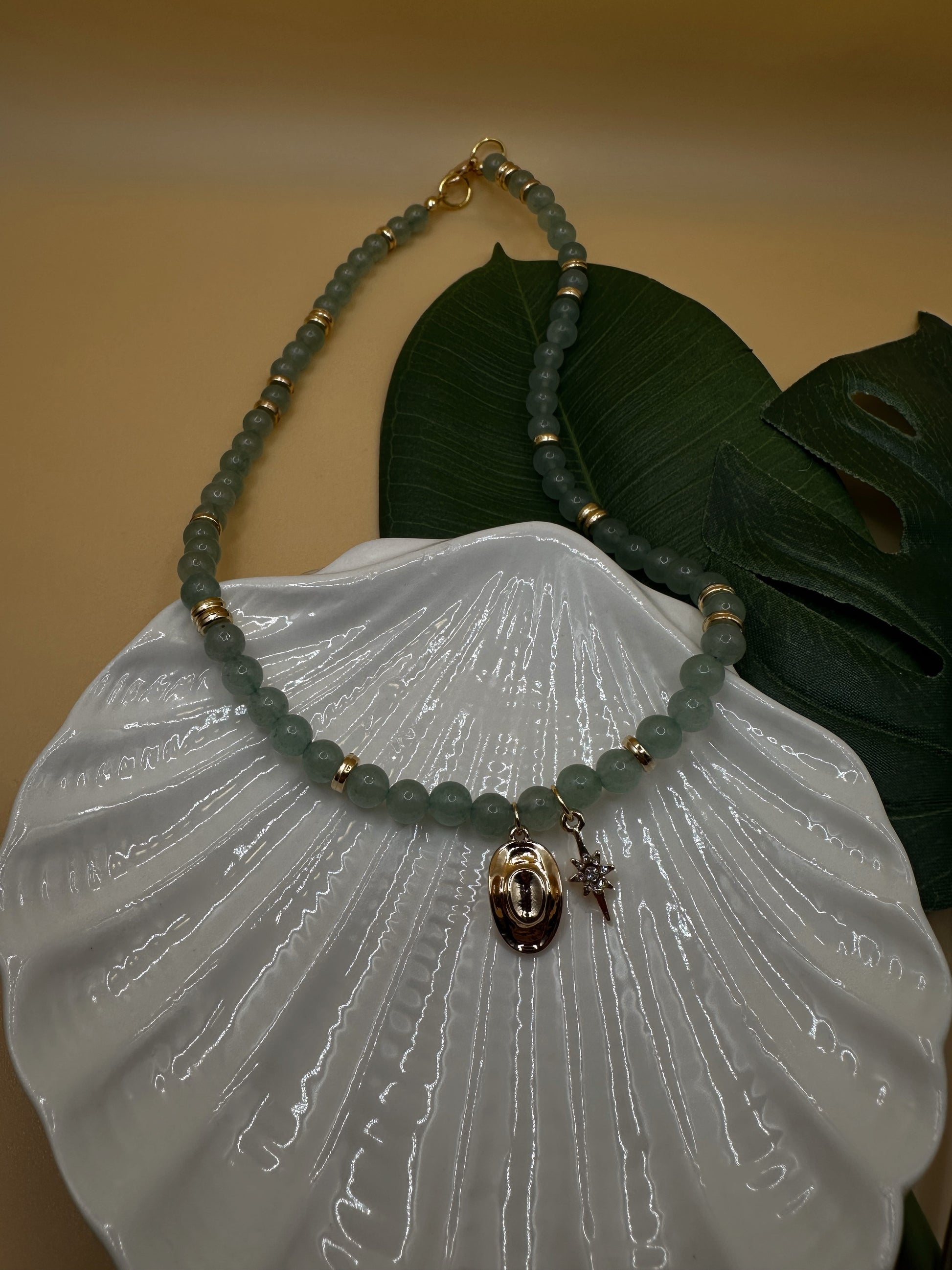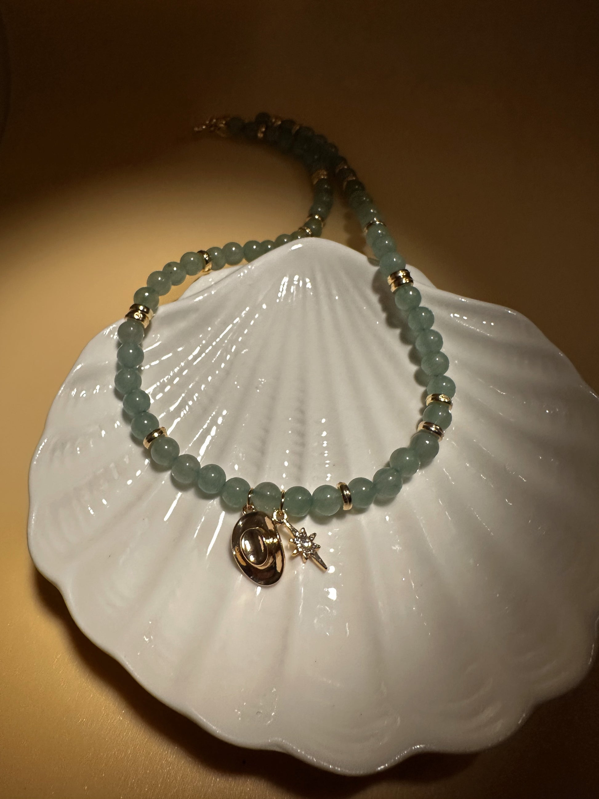 Add a splash of fun to your look with the Starlight Cowboy Necklace. Light emerald green beads shimmer alongside gold spacers, while a charming gold cowboy hat and star take center stage—perfect for adding a playful, western-inspired twist to any outfit.