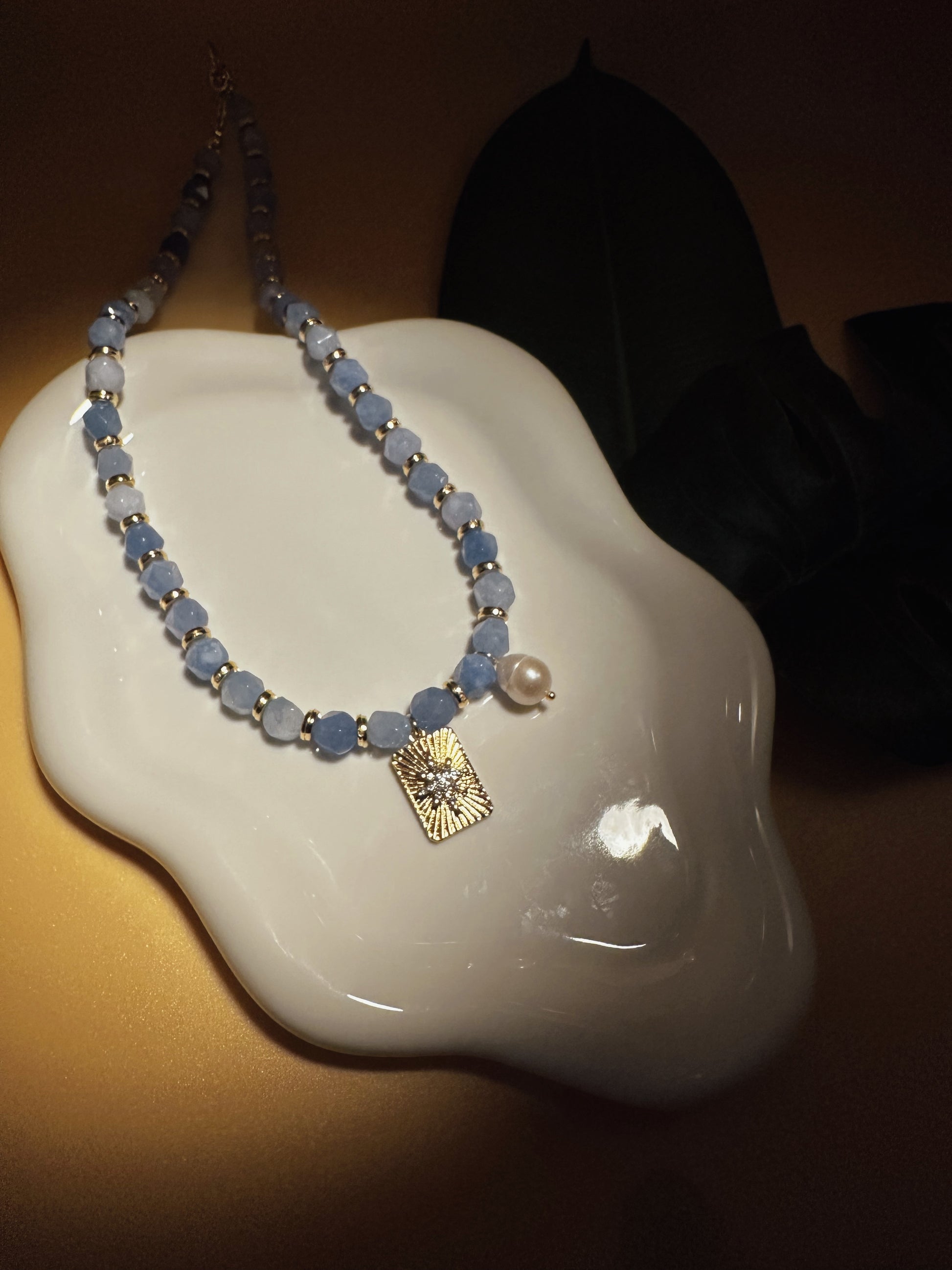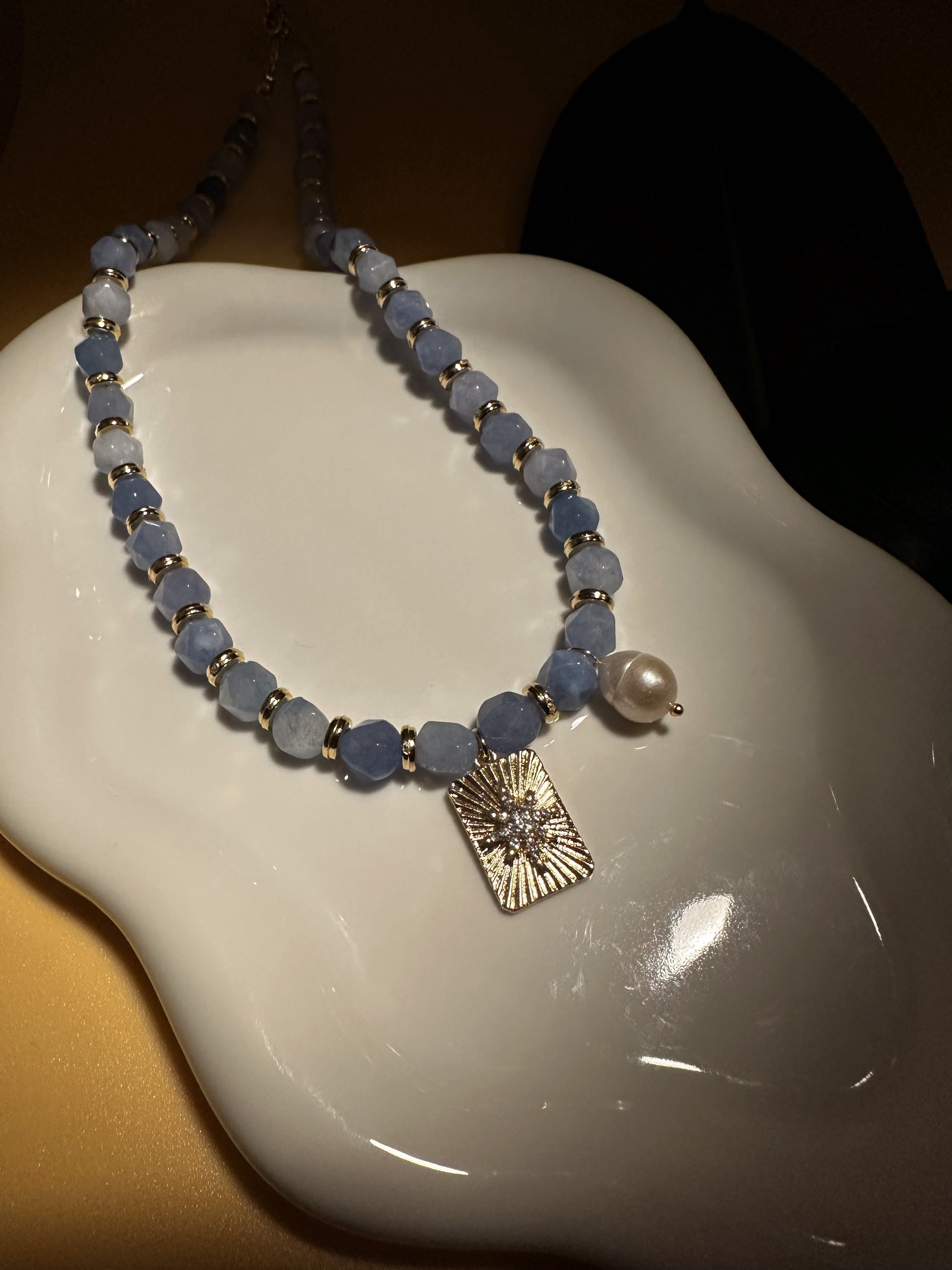 Add a sparkle to your style with this playful Starlight Pearl Necklace. Featuring cool blue gemstone beads paired with shiny gold accents, it charms with a gold diamond star and a delicate pearl. Perfect for adding a touch of whimsy and elegance to any outfit.