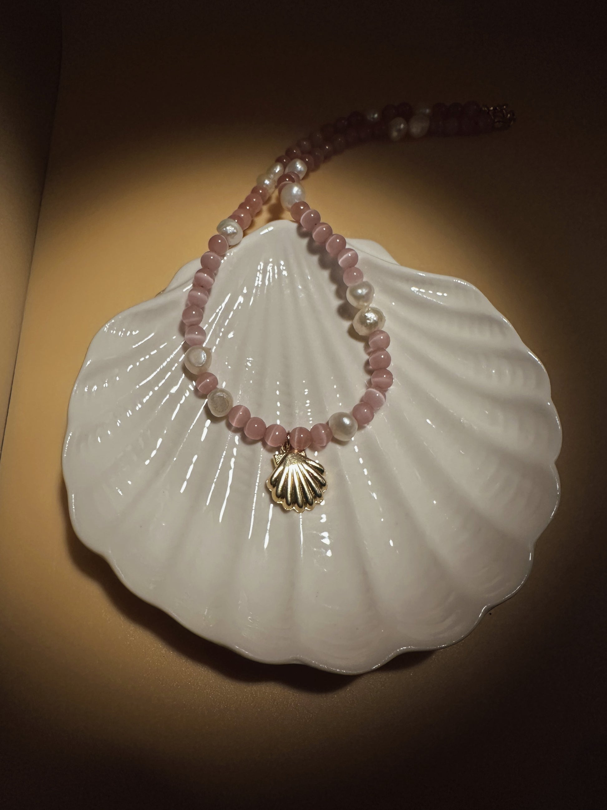 Add a splash of charm to your look with this playful necklace featuring soft pink freshwater pearls and a shiny gold seashell accent at its center. Perfect for brightening any outfit with a touch of seaside whimsy and delicate elegance. Part of the "Summer Never Ends Collection"