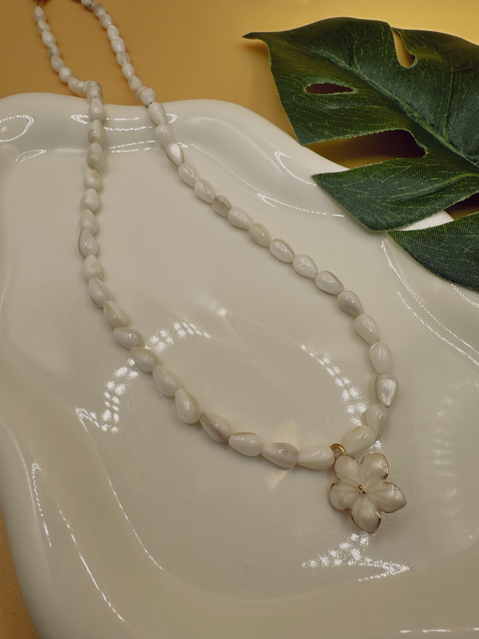 Brighten your day with the White Sand Flower Necklace, featuring delicate white shimmering rice beads and a charming gold and white marble flower centerpiece. This playful design adds a touch of fun and elegance to any outfit, perfect for those who love a subtle splash of whimsy in their jewelry collection.